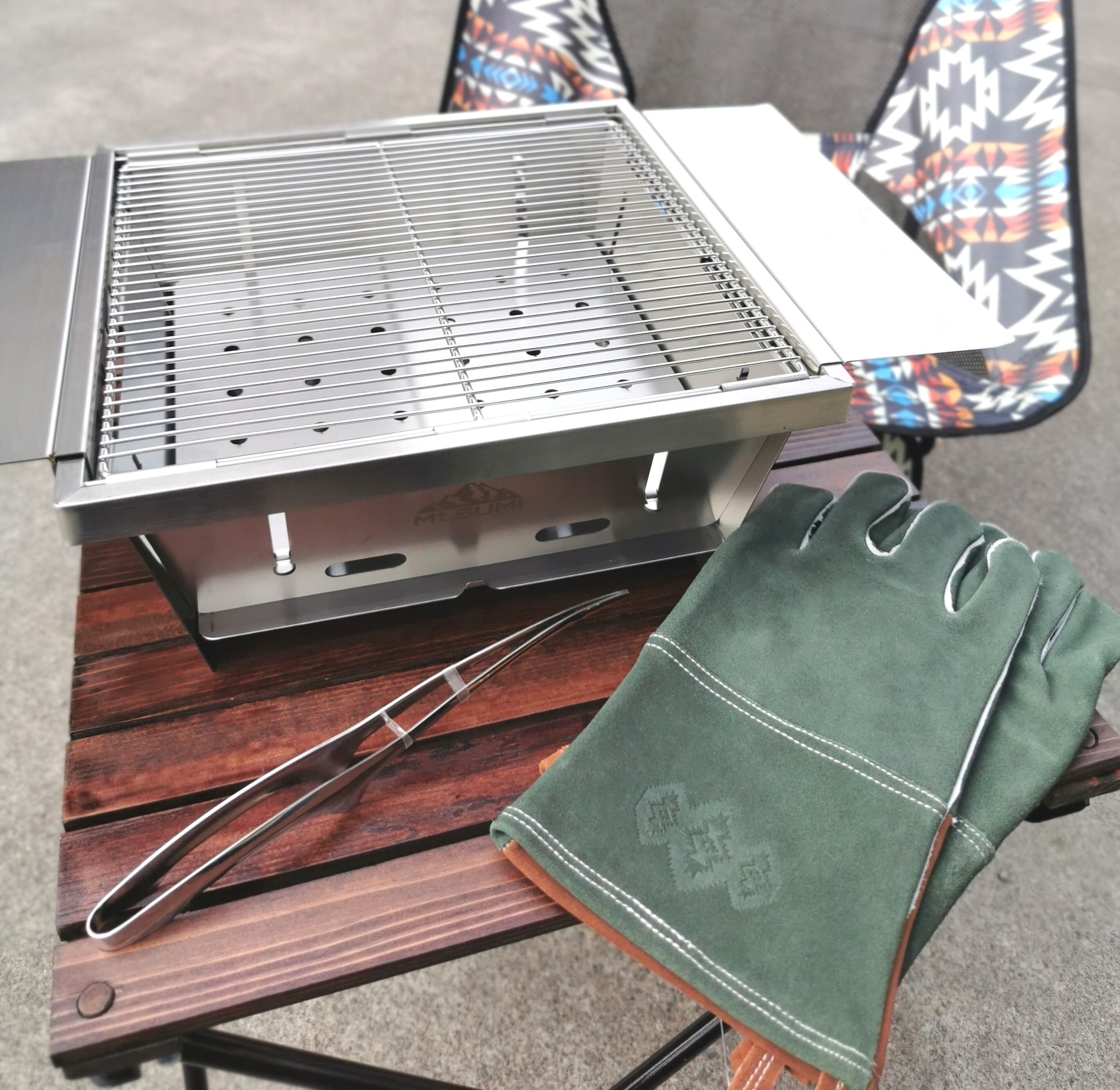 熱に強い牛革製グローブがセットになっているので、初心者キャンパーも安心して炭や薪を取り扱えます。
