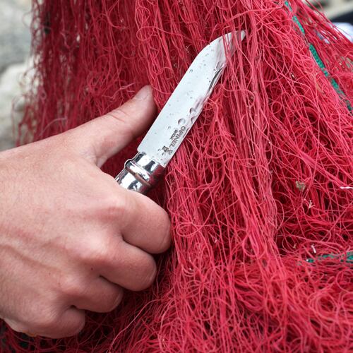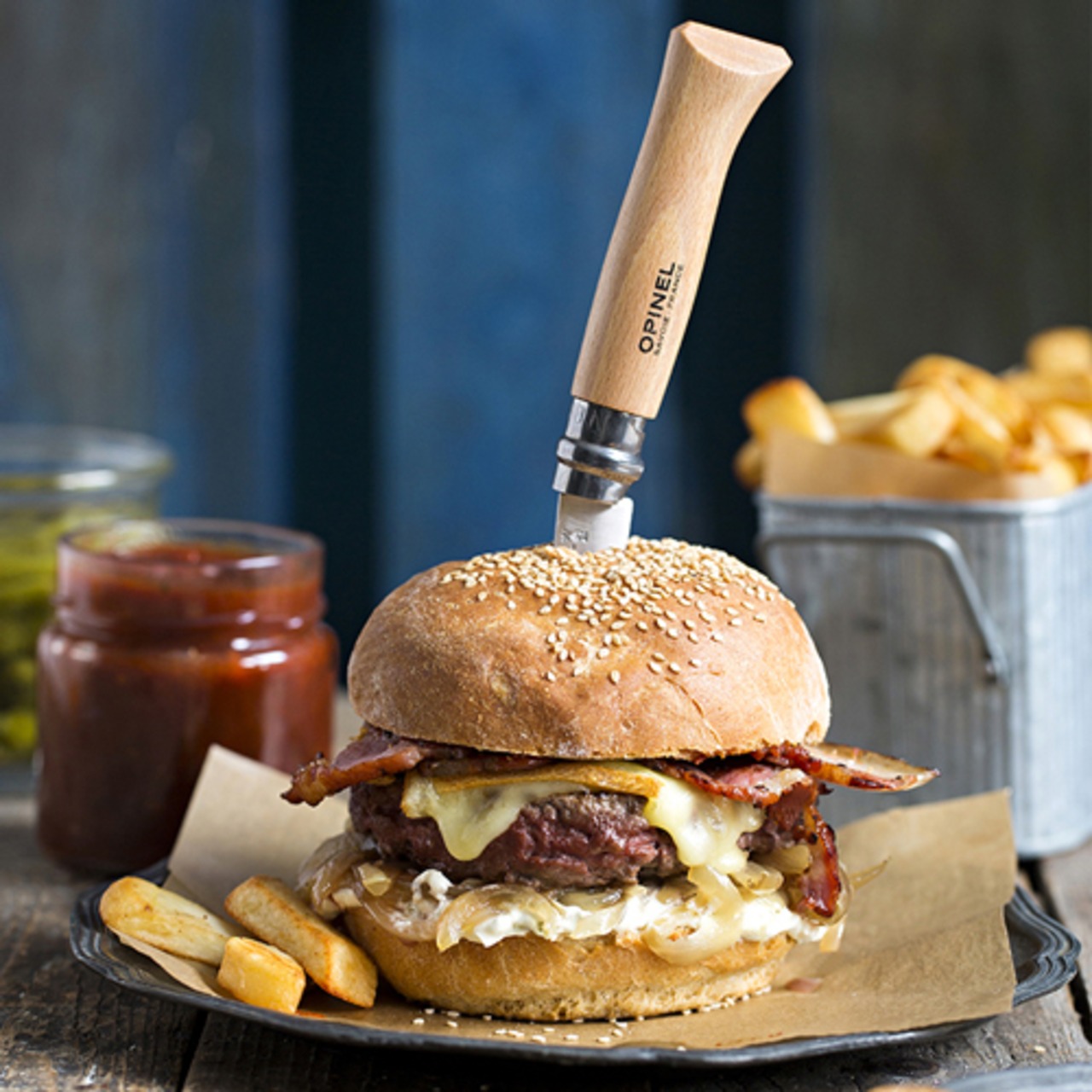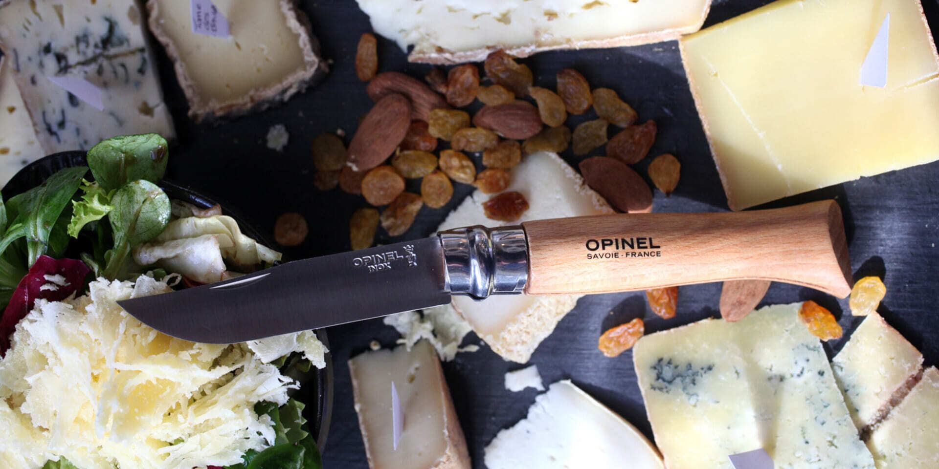 ステンレススチールナイフはサビに強いので、カーボンスチールナイフほど頻繁にメンテナンスを必要とせず、お手入れも簡単。刃には「OPINELのロゴ」「王冠を戴く手」と共にステンレスを意味する「INOX」の文字が刻印されています。